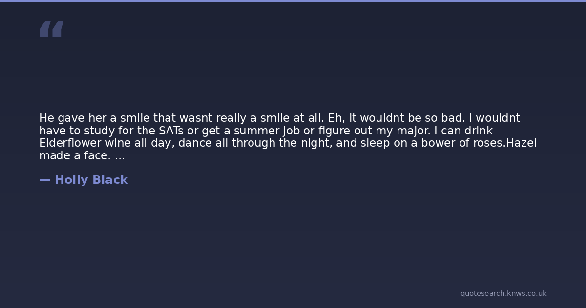 He gave her a smile that wasnt really a smile at all. Eh, it wouldnt be so bad. I wouldnt have to study for the SATs or get a summer job or figure out my major. I can drink Elderflower wine all day, dance all through the night, and sleep on a bower of roses.Hazel made a face. Im pretty sure there are some colleges where you can do that. I bet there are some colleges where you can major in that.