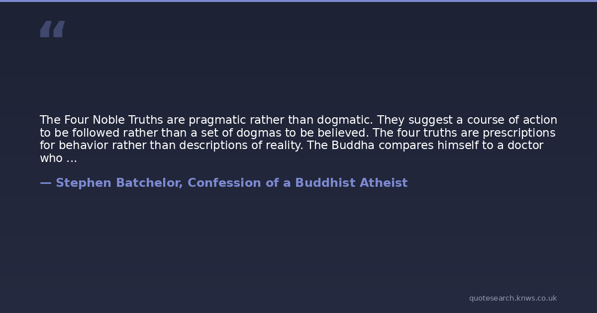 The Four Noble Truths are pragmatic rather than dogmatic. They suggest a course of action to be followed rather than a set of dogmas to be believed. The four truths are prescriptions for behavior rather than descriptions of reality. The Buddha compares himself to a doctor who offers a course of therapeutic treatment to heal ones ills. To embark on such a therapy is not designed to bring one any closer to the Truth but to enable ones life to flourish here and now, hopefully leaving a legacy that will continue to have beneficial repercussions after ones death. (154)