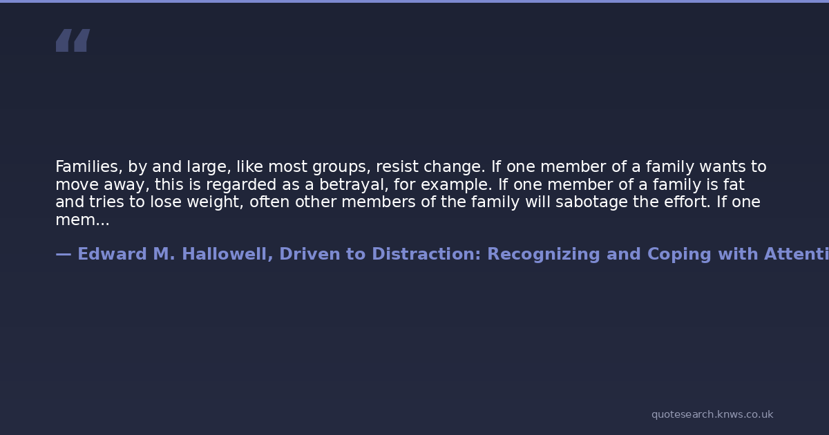 Families, by and large, like most groups, resist change. If one member of a family wants to move away, this is regarded as a betrayal, for example. If one member of a family is fat and tries to lose weight, often other members of the family will sabotage the effort. If one member of the family wants to get out of a role he or she has been playing for years, this is usually difficult ot do because the rest of the family tries not to let it happen. If your role is clown, you remain the clown. If your role is responsible oldest child, you probably keep that role within your family for your entire life. If you are the black sheep, you'll find it very diffcult to change colors in the eyes of your family no matter how many good deeds you do.