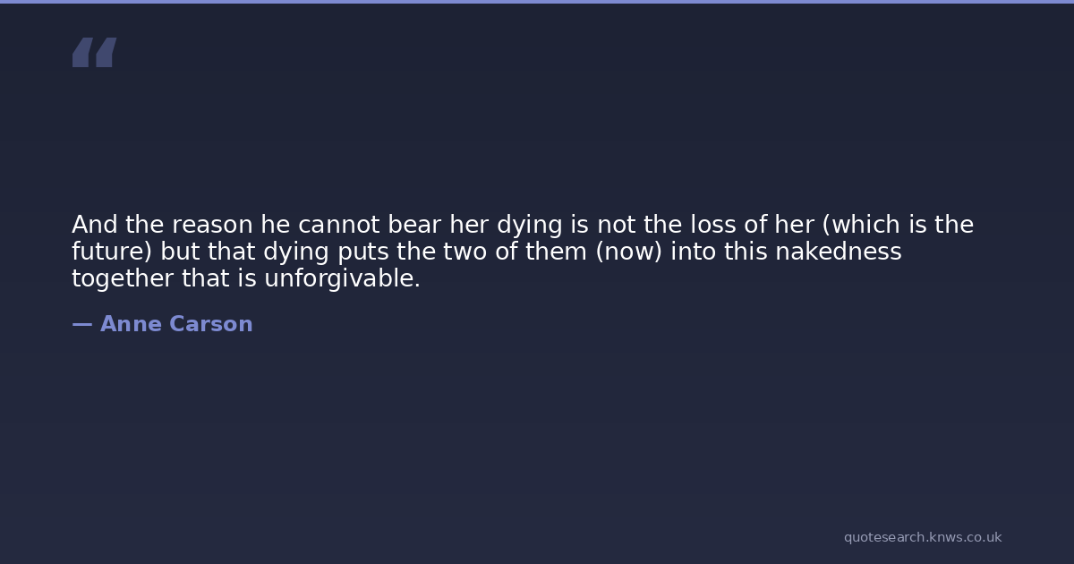 And the reason he cannot bear her dying is not the loss of her (which is the future) but that dying puts the two of them (now) into this nakedness together that is unforgivable.