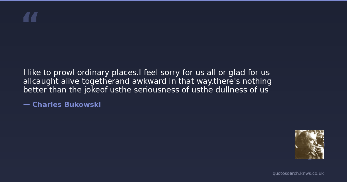 I like to prowl ordinary places.I feel sorry for us all or glad for us allcaught alive togetherand awkward in that way.there's nothing better than the jokeof usthe seriousness of usthe dullness of us