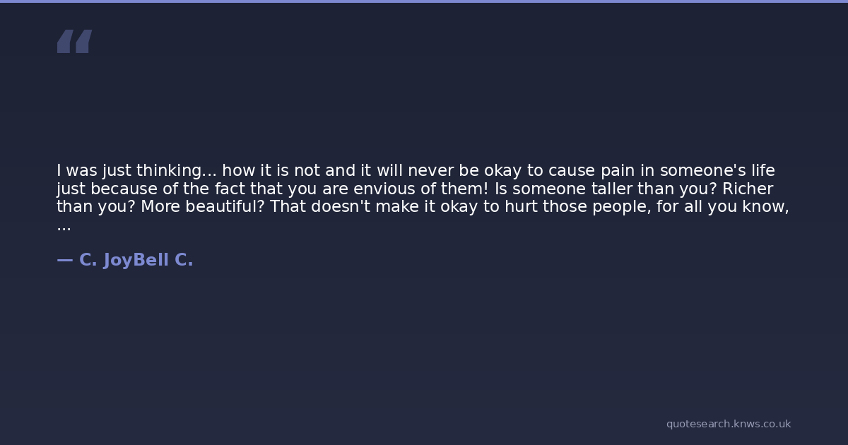 I was just thinking... how it is not and it will never be okay to cause pain in someone's life just because of the fact that you are envious of them! Is someone taller than you? Richer than you? More beautiful? That doesn't make it okay to hurt those people, for all you know, they bear deep wounds and carry heavy burdens and their heartache is far greater than anything you could ever bear! People try to hurt people that they're envious of, without knowing that they are adding to what is already painful. And because someone has more than you or has what it is that you want, doesn't mean that they owe you anything! It's not their fault! Be careful, you may just be wounding an angel soul, and a wound inflicted upon an angel soul, will always, always come back to haunt- YOU.