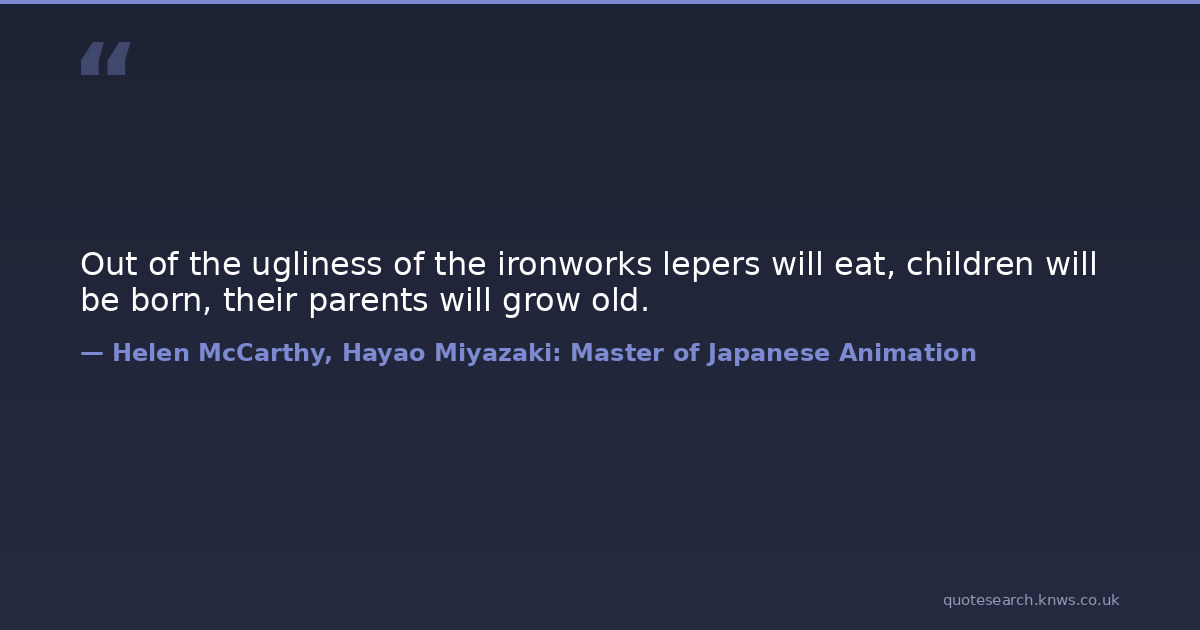 Out of the ugliness of the ironworks lepers will eat, children will be born, their parents will grow old. animation film hayao-miyazaki japan Download Image Share on X Share on Facebook Copy Link