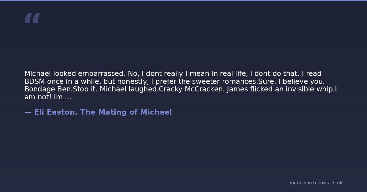 Michael looked embarrassed. No, I dont really I mean in real life, I dont do that. I read BDSM once in a while, but honestly, I prefer the sweeter romances.Sure. I believe you. Bondage Ben.Stop it. Michael laughed.Cracky McCracken. James flicked an invisible whip.I am not! Im more like Nick Normal.Nipple Clamp Ned.Vince Vanilla.James gave him a dubious look and snorted. I doubt that very much.Michael shrugged with an evil little smile. Well, maybe not entirely vanilla.