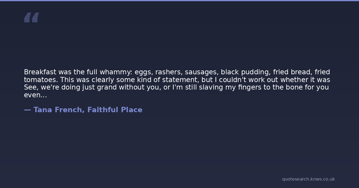 Breakfast was the full whammy: eggs, rashers, sausages, black pudding, fried bread, fried tomatoes. This was clearly some kind of statement, but I couldn't work out whether it was See, we're doing just grand without you, or I'm still slaving my fingers to the bone for you even though you don't deserve it, or possibly We'll be even when this lot gives you a heart attack.