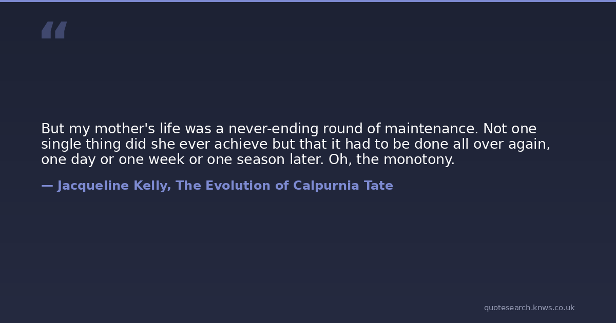 But my mother's life was a never-ending round of maintenance. Not one single thing did she ever achieve but that it had to be done all over again, one day or one week or one season later. Oh, the monotony.