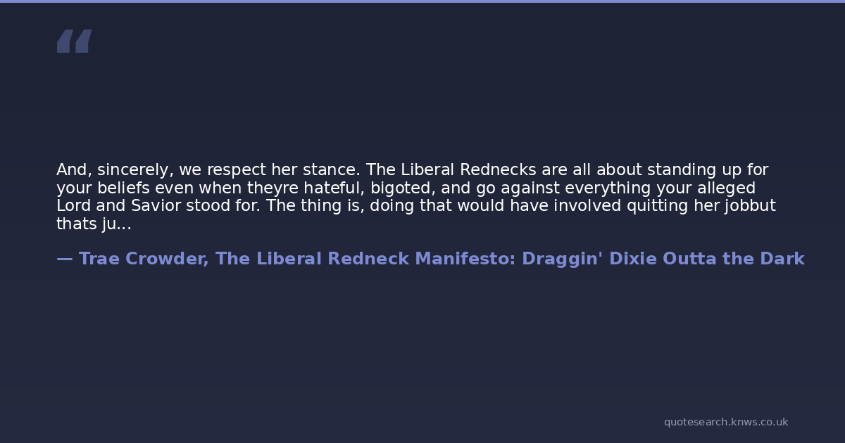 And, sincerely, we respect her stance. The Liberal Rednecks are all about standing up for your beliefs even when theyre hateful, bigoted, and go against everything your alleged Lord and Savior stood for. The thing is, doing that would have involved quitting her jobbut thats just something the four-times-married mother was not prepared to do for her faith. Go on TV and be called a hero by powerful politicians who agree with her and her stand? Sure, thats fine. Have the Church pay for her legal bills and prop her up (instead of, oh we dont know, giving that money to the poor)? Yes, sir. But actually quit instead of breaking an oath (which, by the way, is a sin)? Thats just something Jesus apparently wouldnt do. Kim Davis is an analogy for Christians at large in the South. She was not oppressed. She was not forced to do anything. She could have quit. The truth is she did not want to quit her job as an elected official. She wanted to bend the political will of those around her so she could prevent other humans from marrying each other because she didnt like the idea of it. Thats not oppressionthats someone trying to use the inordinate amount of power they have (over the media and literally as the clerk) to affect the lives of strangers she disagrees with. Guess what that is? Yup. That is oppression.