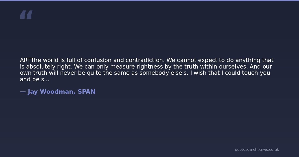 ARTThe world is full of confusion and contradiction. We cannot expect to do anything that is absolutely right. We can only measure rightness by the truth within ourselves. And our own truth will never be quite the same as somebody else's. I wish that I could touch you and be sure that it was the right thing to do. I only want to touch you briefly. Just once so that you will know. We are flesh and blood and full of faults. But we are also full of warmth. The world is full of confusion but there is compassion in its midst. communication via simple touch can transmit so much of us in just one minute. Like a painting or a piece of music. I want to touch your soul. I only wish I could be sure it was the right thing to do.