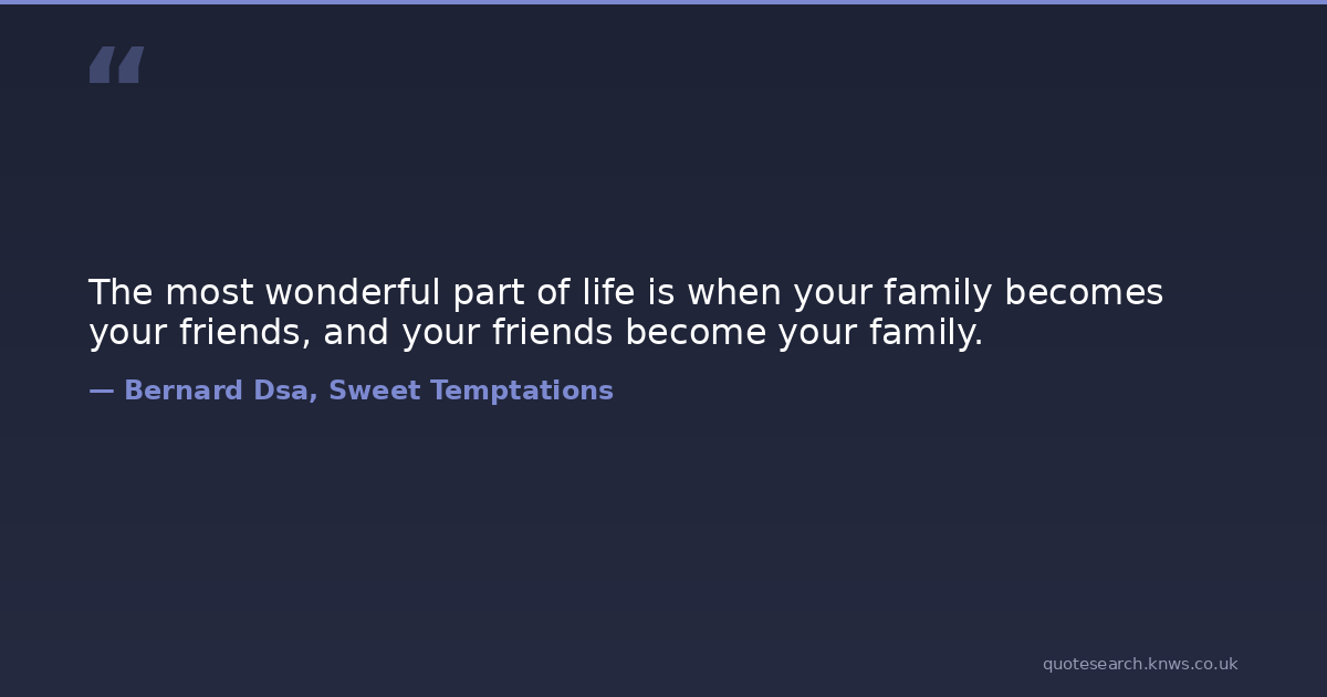 The most wonderful part of life is when your family becomes your friends, and your friends become your family. family-relationships Download Image Share on X Share on Facebook Copy Link