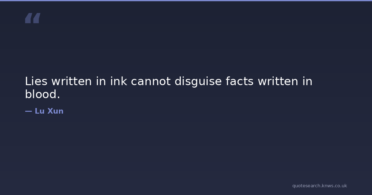 Lies written in ink cannot disguise facts written in blood. chinese-quote facts lu-xun Download Image Share on X Share on Facebook Copy Link