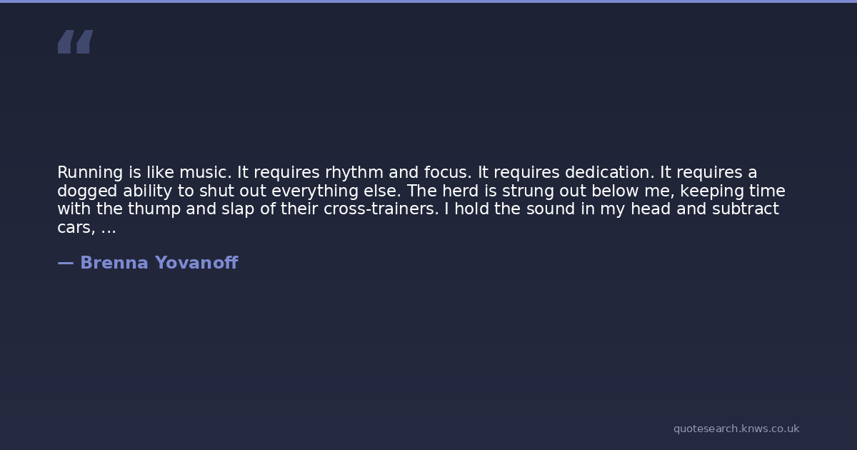 Running is like music. It requires rhythm and focus. It requires dedication. It requires a dogged ability to shut out everything else. The herd is strung out below me, keeping time with the thump and slap of their cross-trainers. I hold the sound in my head and subtract cars, trucks, motorcycles, voices until its nothing but a song.