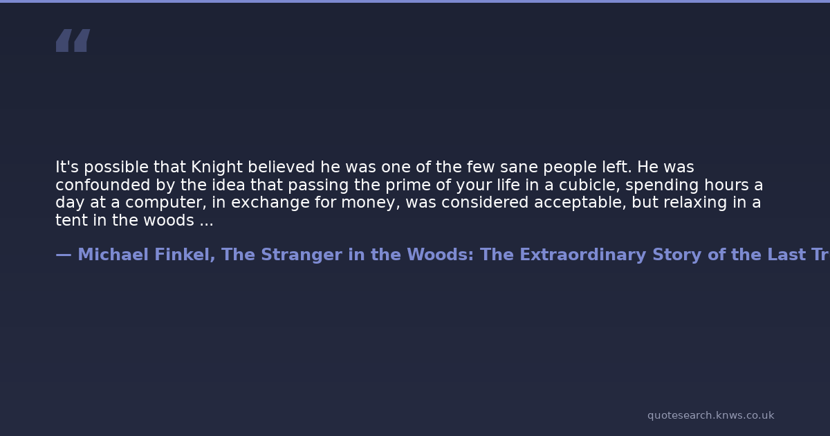It's possible that Knight believed he was one of the few sane people left. He was confounded by the idea that passing the prime of your life in a cubicle, spending hours a day at a computer, in exchange for money, was considered acceptable, but relaxing in a tent in the woods was disturbed. Observing the trees was indolent; cutting them down was enterprising. What did Knight do for a living? He lived for a living.