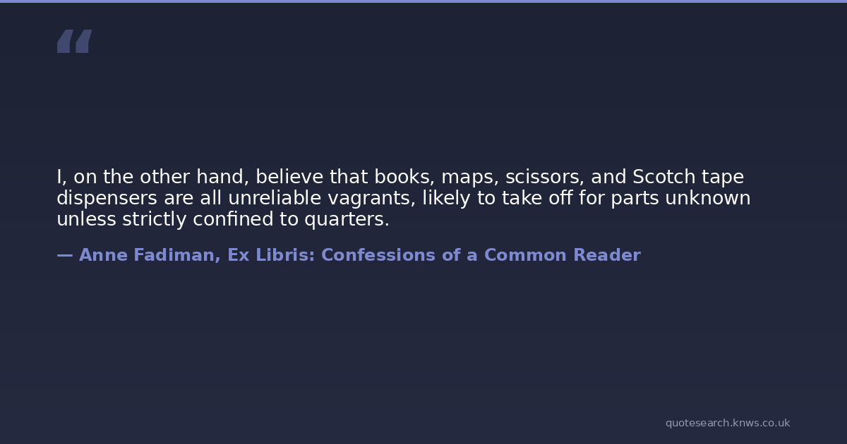 I, on the other hand, believe that books, maps, scissors, and Scotch tape dispensers are all unreliable vagrants, likely to take off for parts unknown unless strictly confined to quarters.