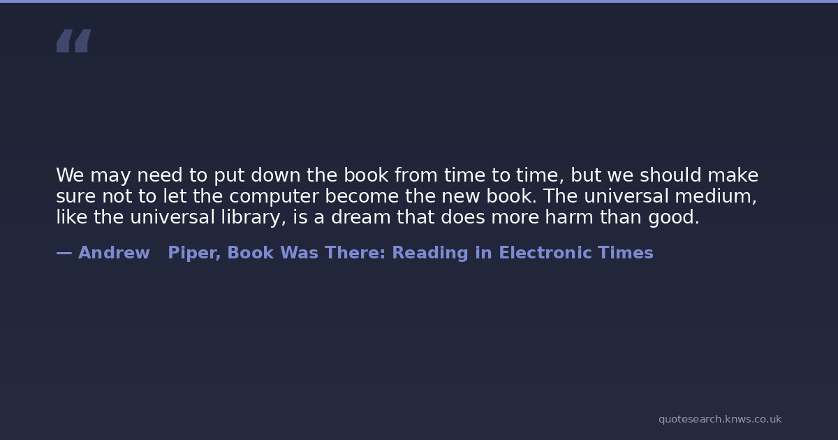 We may need to put down the book from time to time, but we should make sure not to let the computer become the new book. The universal medium, like the universal library, is a dream that does more harm than good.