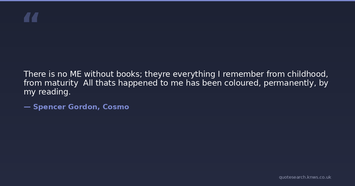 There is no ME without books; theyre everything I remember from childhood, from maturity All thats happened to me has been coloured, permanently, by my reading.
