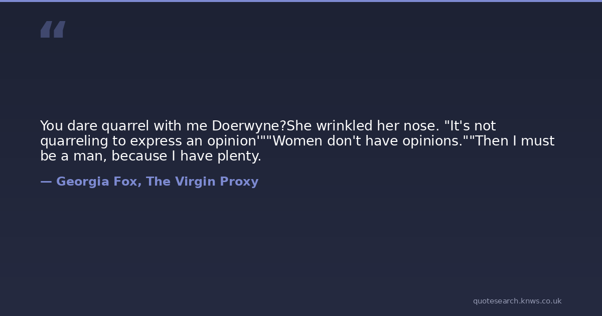 You dare quarrel with me Doerwyne?She wrinkled her nose. "It's not quarreling to express an opinion'""Women don't have opinions.""Then I must be a man, because I have plenty.