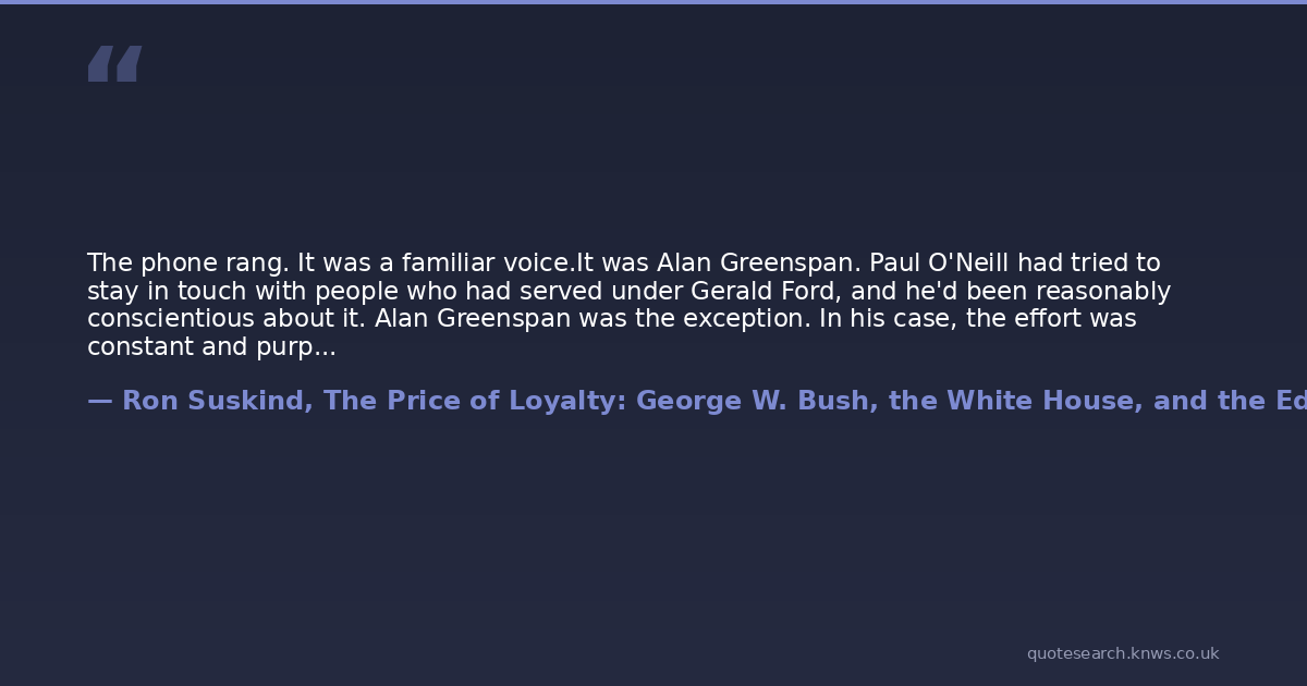 The phone rang. It was a familiar voice.It was Alan Greenspan. Paul O'Neill had tried to stay in touch with people who had served under Gerald Ford, and he'd been reasonably conscientious about it. Alan Greenspan was the exception. In his case, the effort was constant and purposeful. When Greenspan was the chairman of Ford's Council of Economic Advisers, and O'Neill was number two at OMB, they had become a kind of team. Never social so much. They never talked about families or outside interests. It was all about ideas: Medicare financing or block grants - a concept that O'Neill basically invented to balance federal power and local autonomy - or what was really happening in the economy. It became clear that they thought well together. President Ford used to have them talk about various issues while he listened. After a while, each knew how the other's mind worked, the way married couples do.In the past fifteen years, they'd made a point of meeting every few months. It could be in New York, or Washington, or Pittsburgh. They talked about everything, just as always. Greenspan, O'Neill told a friend, "doesn't have many people who don't want something from him, who will talk straight to him. So that's what we do together - straight talk."O'Neill felt some straight talk coming in."Paul, I'll be blunt. We really need you down here," Greenspan said. "There is a real chance to make lasting changes. We could be a team at the key moment, to do the things we've always talked about."The jocular tone was gone. This was a serious discussion. They digressed into some things they'd "always talked about," especially reforming Medicare and Social Security. For Paul and Alan, the possibility of such bold reinventions bordered on fantasy, but fantasy made real."We have an extraordinary opportunity," Alan said. Paul noticed that he seemed oddly anxious. "Paul, your presence will be an enormous asset in the creation of sensible policy."Sensible policy. This was akin to prayer from Greenspan. O'Neill, not expecting such conviction from his old friend, said little. After a while, he just thanked Alan. He said he always respected his counsel. He said he was thinking hard about it, and he'd call as soon as he decided what to do.The receiver returned to its cradle. He thought about Greenspan. They were young men together in the capital. Alan stayed, became the most noteworthy Federal Reserve Bank chairman in modern history and, arguably the most powerful public official of the past two decades. O'Neill left, led a corporate army, made a fortune, and learned lessons - about how to think and act, about the importance of outcomes - that you can't ever learn in a government.But, he supposed, he'd missed some things. There were always trade-offs. Talking to Alan reminded him of that. Alan and his wife, Andrea Mitchell, White House correspondent for NBC news, lived a fine life. They weren't wealthy like Paul and Nancy. But Alan led a life of highest purpose, a life guided by inquiry.Paul O'Neill picked up the telephone receiver, punched the keypad."It's me," he said, always his opening.He started going into the details of his trip to New York from Washington, but he's not much of a phone talker - Nancy knew that - and the small talk trailed off."I think I'm going to have to do this."She was quiet. "You know what I think," she said.She knew him too well, maybe. How bullheaded he can be, once he decides what's right. How he had loved these last few years as a sovereign, his own man. How badly he was suited to politics, as it was being played. And then there was that other problem: she'd almost always been right about what was best for him."Whatever, Paul. I'm behind you. If you don't do this, I guess you'll always regret it."But it was clearly about what he wanted, what he needed.Paul thanked her. Though somehow a thank-you didn't seem appropriate.And then he realized she was crying.