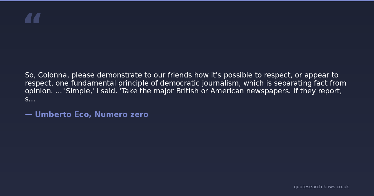 So, Colonna, please demonstrate to our friends how it's possible to respect, or appear to respect, one fundamental principle of democratic journalism, which is separating fact from opinion. ...''Simple,' I said. 'Take the major British or American newspapers. If they report, say, a fire or a car accident, then obviously they can't indulge in saying what they think. And so they introduce into the piece, in quotation marks, the statements of a witness, a man in the street, someone who represents public opinion. Those statements, once put in quotes, become facts - in other words, it's a fact that that person expressed that opinion. But it might be assumed that the journalist has only quoted someone who thinks like him. So there will be two conflicting statements to show, as a fact, that there are varying opinions on a particular issue, and the newspaper is taking account of this irrefutable fact. The trick lies in quoting first a trivial opinion and then another opinion that is more respectable, and more closely reflects the journalist's view. In this way, readers are under the impression that they are being informed about two facts, but they're persuaded to accept just one view as being more convincing.