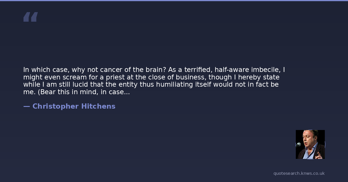 In which case, why not cancer of the brain? As a terrified, half-aware imbecile, I might even scream for a priest at the close of business, though I hereby state while I am still lucid that the entity thus humiliating itself would not in fact be me. (Bear this in mind, in case of any later rumors or fabrications.)