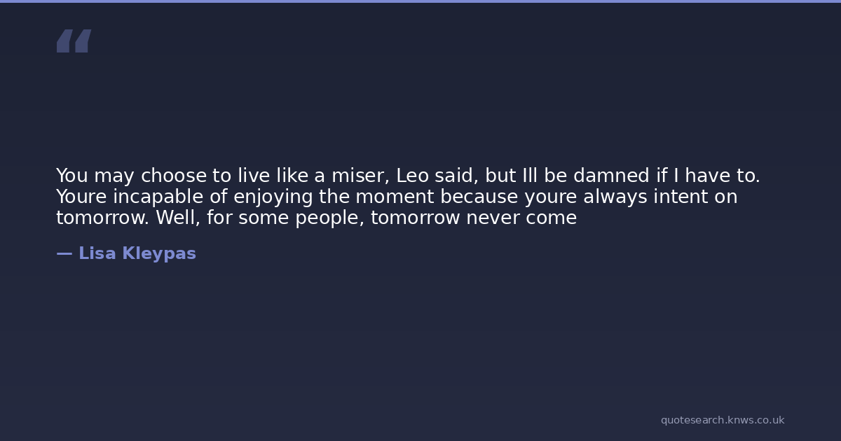 You may choose to live like a miser, Leo said, but Ill be damned if I have to. Youre incapable of enjoying the moment because youre always intent on tomorrow. Well, for some people, tomorrow never come