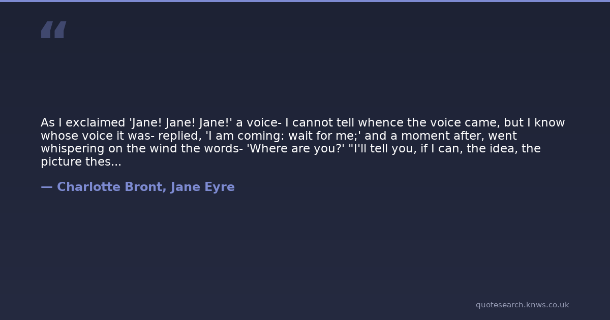 As I exclaimed 'Jane! Jane! Jane!' a voice- I cannot tell whence the voice came, but I know whose voice it was- replied, 'I am coming: wait for me;' and a moment after, went whispering on the wind the words- 'Where are you?' "I'll tell you, if I can, the idea, the picture these words opened to my mind: yet it is difficult to express what I want to express. Ferndean is buried, as you see, in a heavy wood, where sound falls dull, and dies unreverberating. 'Where are you?' seemed spoken amongst mountains; for I heard a hill-sent echo repeat the words. Cooler and fresher at the moment the gale seemed to visit my brow: I could have deemed that in some wild, lone scene, I and Jane were meeting. In spirit, I believe we must have met. You no doubt were, at that hour, in unconscious sleep, Jane: perhaps your soul wandered from its cell to comfort mine; for those were your accents- as certain as I live- they were yours!" Reader, it was on Monday night- near midnight- that I too had received the mysterious summons: those were the very words by which I replied to it.(Mr. Rochester and Jane Eyre)