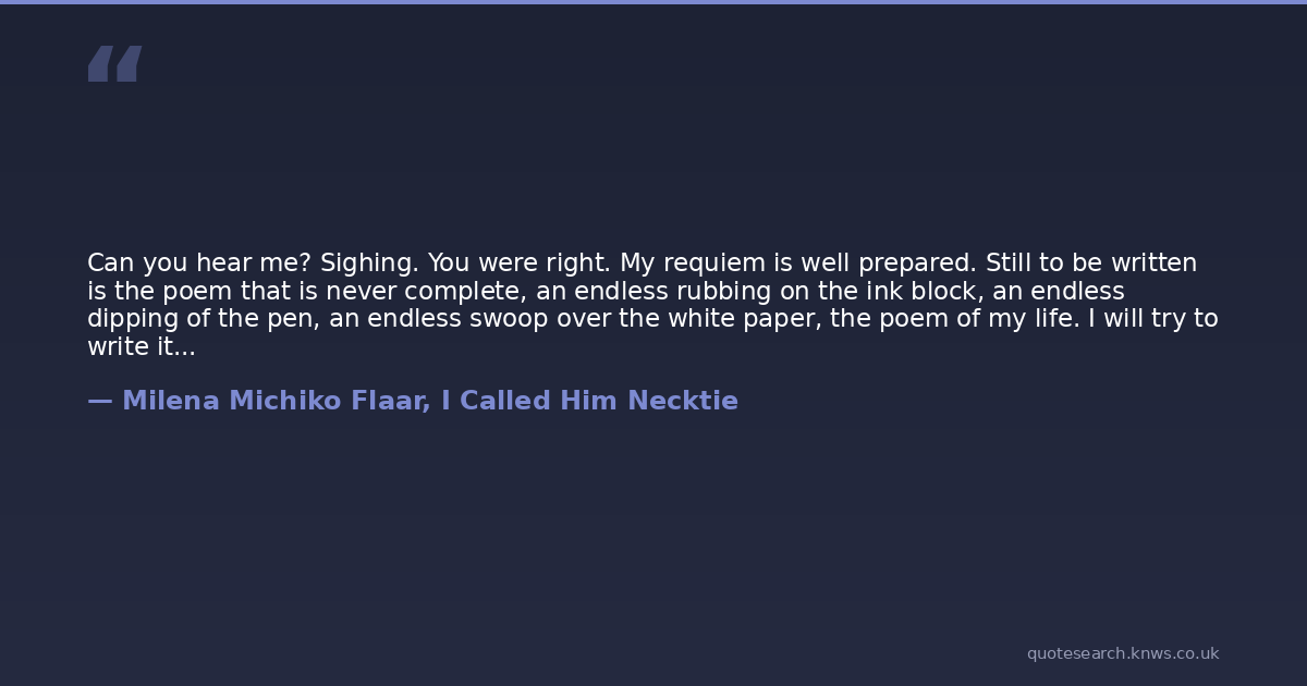 Can you hear me? Sighing. You were right. My requiem is well prepared. Still to be written is the poem that is never complete, an endless rubbing on the ink block, an endless dipping of the pen, an endless swoop over the white paper, the poem of my life. I will try to write it down. Soon, no, now, I will try. The first line. I called him Necktie. I will write: He taught me to see with eyes of feeling.