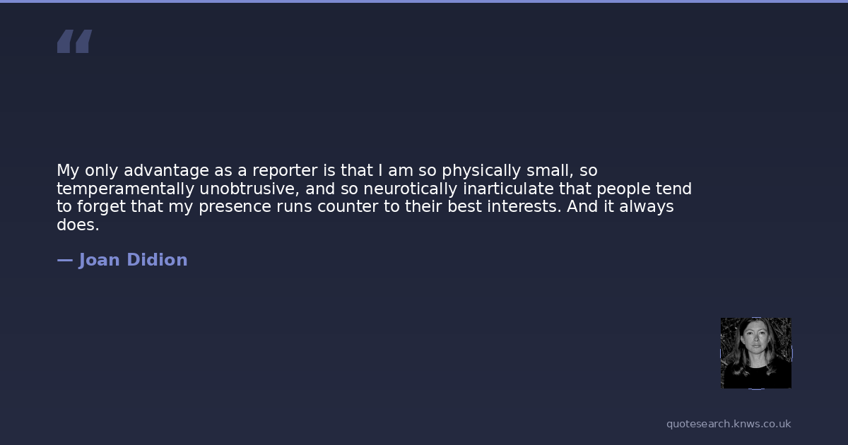 My only advantage as a reporter is that I am so physically small, so temperamentally unobtrusive, and so neurotically inarticulate that people tend to forget that my presence runs counter to their best interests. And it always does.