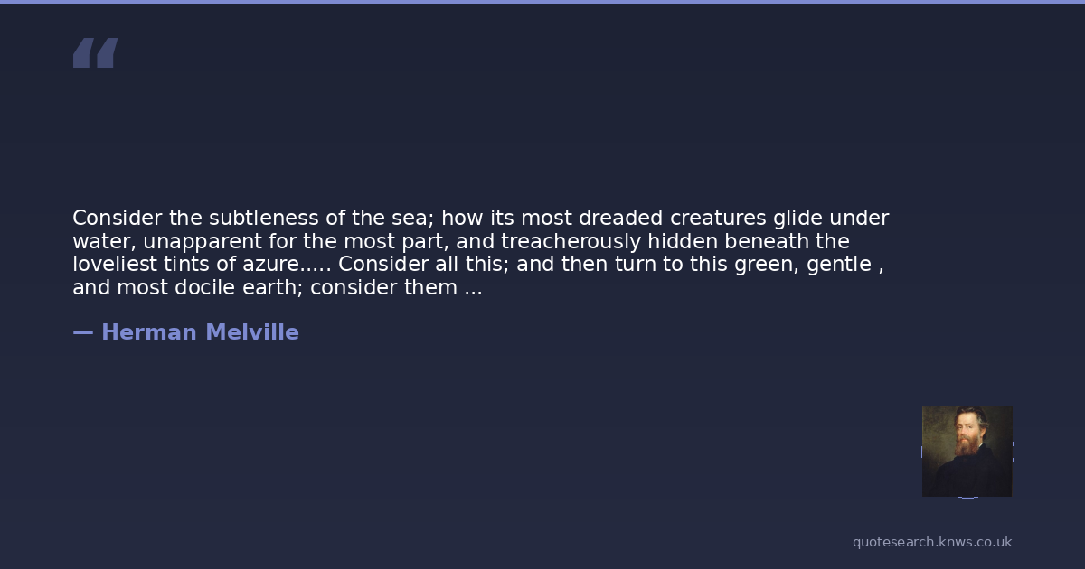 Consider the subtleness of the sea; how its most dreaded creatures glide under water, unapparent for the most part, and treacherously hidden beneath the loveliest tints of azure..... Consider all this; and then turn to this green, gentle , and most docile earth; consider them both, the sea and the land; and do you not find a strange analogy to something in yourself?
