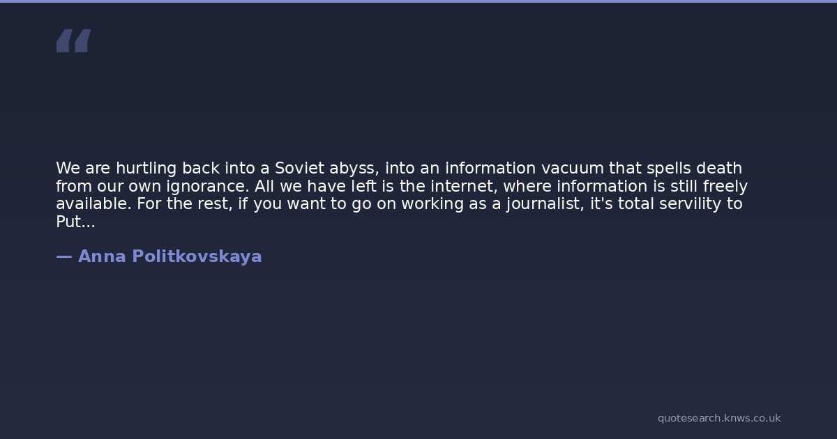 We are hurtling back into a Soviet abyss, into an information vacuum that spells death from our own ignorance. All we have left is the internet, where information is still freely available. For the rest, if you want to go on working as a journalist, it's total servility to Putin. Otherwise, it can be death, the bullet, poison, or trialwhatever our special services, Putin's guard dogs, see fit.