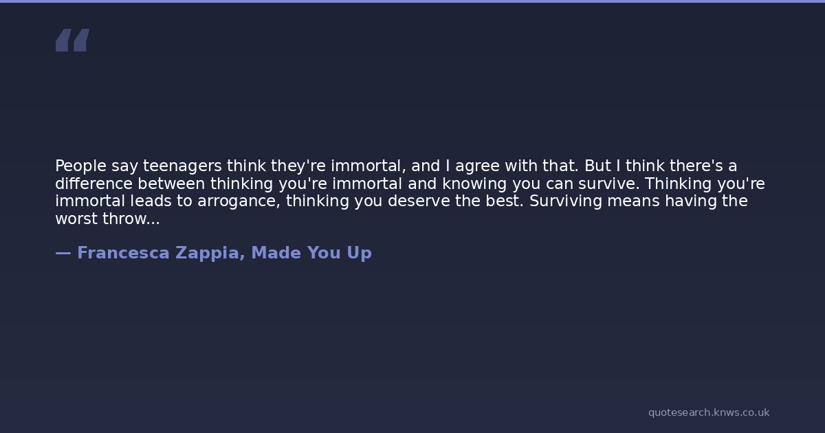 People say teenagers think they're immortal, and I agree with that. But I think there's a difference between thinking you're immortal and knowing you can survive. Thinking you're immortal leads to arrogance, thinking you deserve the best. Surviving means having the worst thrown at you and being able to continue on despite that. It means striving for what you want most, even when it seems our of your reach, even when everything is working against you.