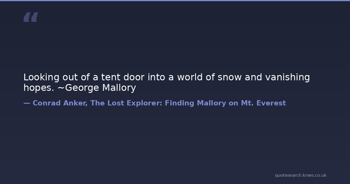 Looking out of a tent door into a world of snow and vanishing hopes. ~George Mallory climbing everest george-mallory mountain Download Image Share on X Share on Facebook Copy Link
