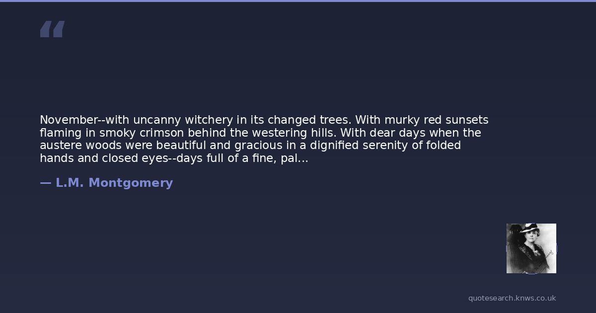 November--with uncanny witchery in its changed trees. With murky red sunsets flaming in smoky crimson behind the westering hills. With dear days when the austere woods were beautiful and gracious in a dignified serenity of folded hands and closed eyes--days full of a fine, pale sunshine that sifted through the late, leafless gold of the juniper-trees and glimmered among the grey beeches, lighting up evergreen banks of moss and washing the colonnades of the pines. Days with a high-sprung sky of flawless turquoise. Days when an exquisite melancholy seemed to hang over the landscape and dream about the lake. But days, too, of the wild blackness of great autumn storms, followed by dank, wet, streaming nights when there was witch-laughter in the pines and fitful moans among the mainland trees. What cared they? Old Tom had built his roof well, and his chimney drew.