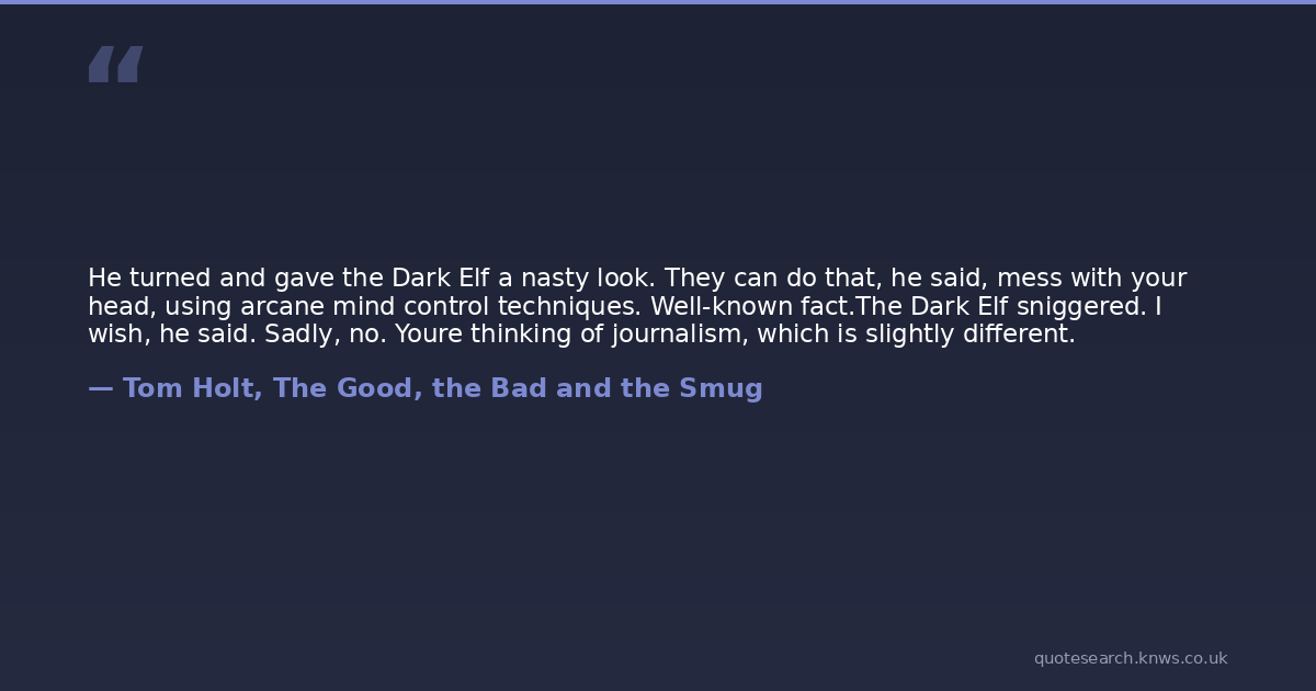 He turned and gave the Dark Elf a nasty look. They can do that, he said, mess with your head, using arcane mind control techniques. Well-known fact.The Dark Elf sniggered. I wish, he said. Sadly, no. Youre thinking of journalism, which is slightly different.