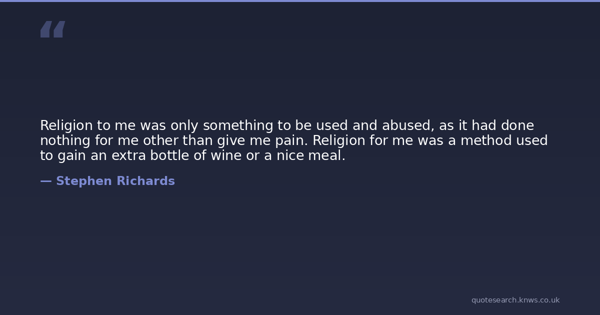 Religion to me was only something to be used and abused, as it had done nothing for me other than give me pain. Religion for me was a method used to gain an extra bottle of wine or a nice meal.