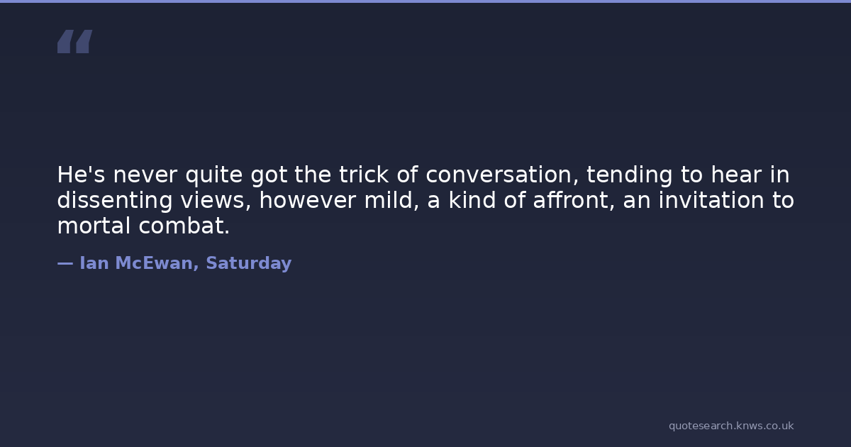 He's never quite got the trick of conversation, tending to hear in dissenting views, however mild, a kind of affront, an invitation to mortal combat.