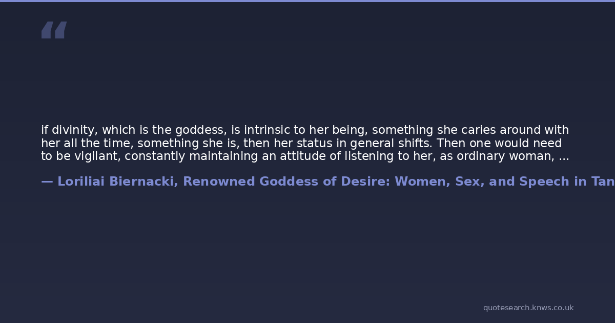 if divinity, which is the goddess, is intrinsic to her being, something she caries around with her all the time, something she is, then her status in general shifts. Then one would need to be vigilant, constantly maintaining an attitude of listening to her, as ordinary woman, which affords a shift in the normative discourse between the genders and that allows for a recognition of her as a subject, as a person to whom one should listen.