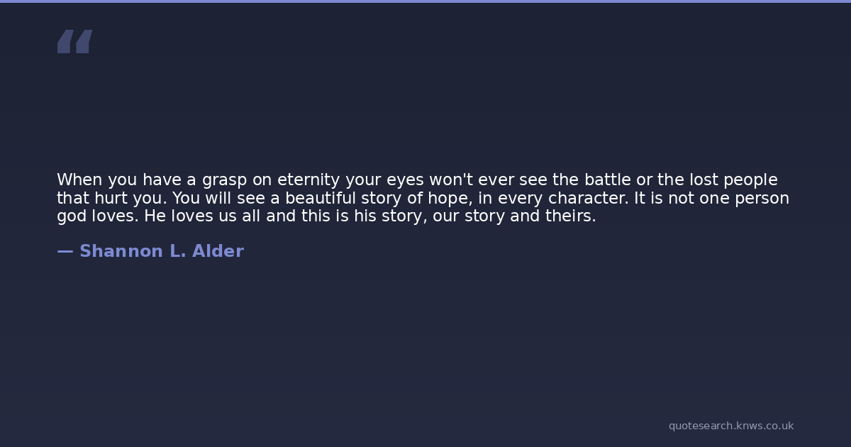 When you have a grasp on eternity your eyes won't ever see the battle or the lost people that hurt you. You will see a beautiful story of hope, in every character. It is not one person god loves. He loves us all and this is his story, our story and theirs.