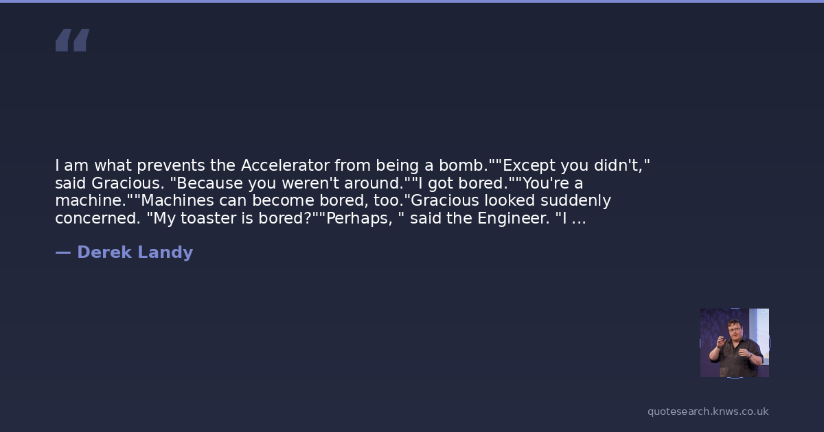 I am what prevents the Accelerator from being a bomb.""Except you didn't," said Gracious. "Because you weren't around.""I got bored.""You're a machine.""Machines can become bored, too."Gracious looked suddenly concerned. "My toaster is bored?""Perhaps, " said the Engineer. "I do not know many toasters.