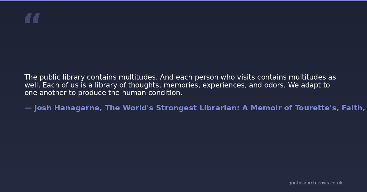 The public library contains multitudes. And each person who visits contains multitudes as well. Each of us is a library of thoughts, memories, experiences, and odors. We adapt to one another to produce the human condition.