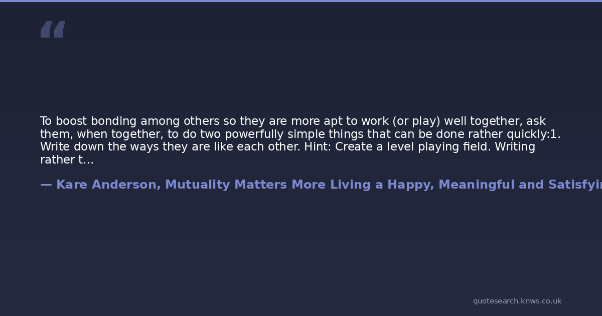 To boost bonding among others so they are more apt to work (or play) well together, ask them, when together, to do two powerfully simple things that can be done rather quickly:1. Write down the ways they are like each other. Hint: Create a level playing field. Writing rather than immediately sharing helps slow thinkers keep up with fast thinkers. Fast thinkers aren't smarter, just different in their thinking processes, and each kind has advantages and pitfalls, so they can accomplish more together than when a majority in a group think and speak at the same speed. Hint: Salespeople are often fast thinkers.2. Share with each other what they wrote, going around the circle, one by one.Bonus benefit: Other studies show that when you reflect on how you are similar to those with whom you are talking, you pay more attention to them. You care about them more. That spurs the other person to listen more closely to you.