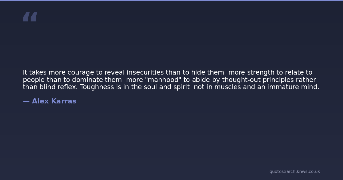 It takes more courage to reveal insecurities than to hide them more strength to relate to people than to dominate them more "manhood" to abide by thought-out principles rather than blind reflex. Toughness is in the soul and spirit not in muscles and an immature mind.