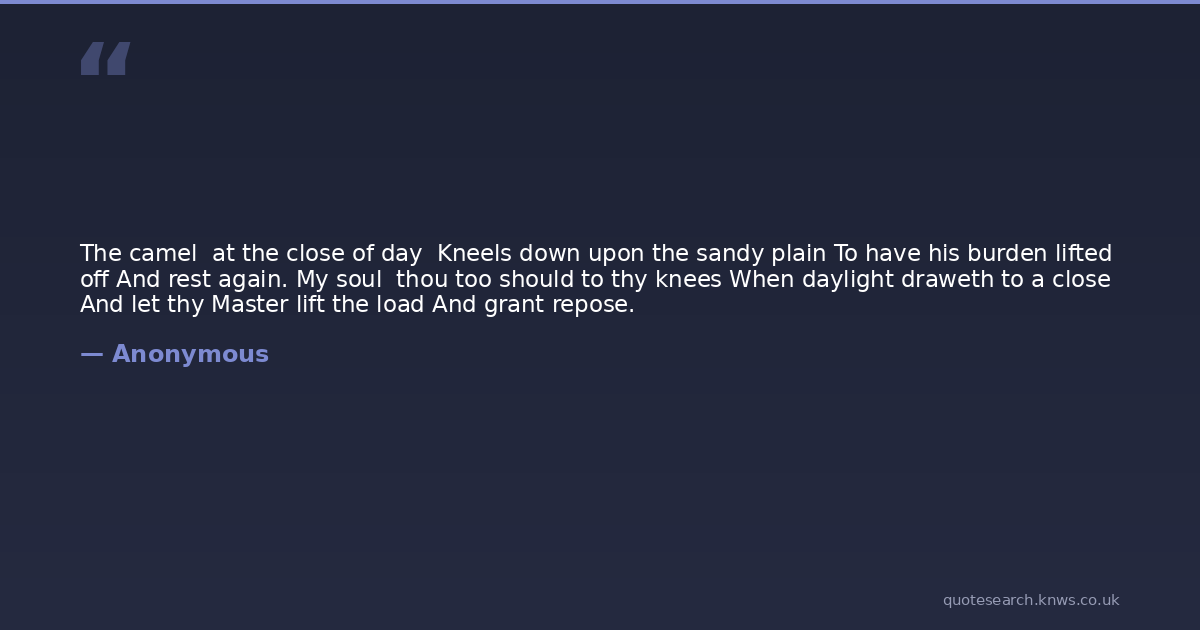 The camel at the close of day Kneels down upon the sandy plain To have his burden lifted off And rest again. My soul thou too should to thy knees When daylight draweth to a close And let thy Master lift the load And grant repose.