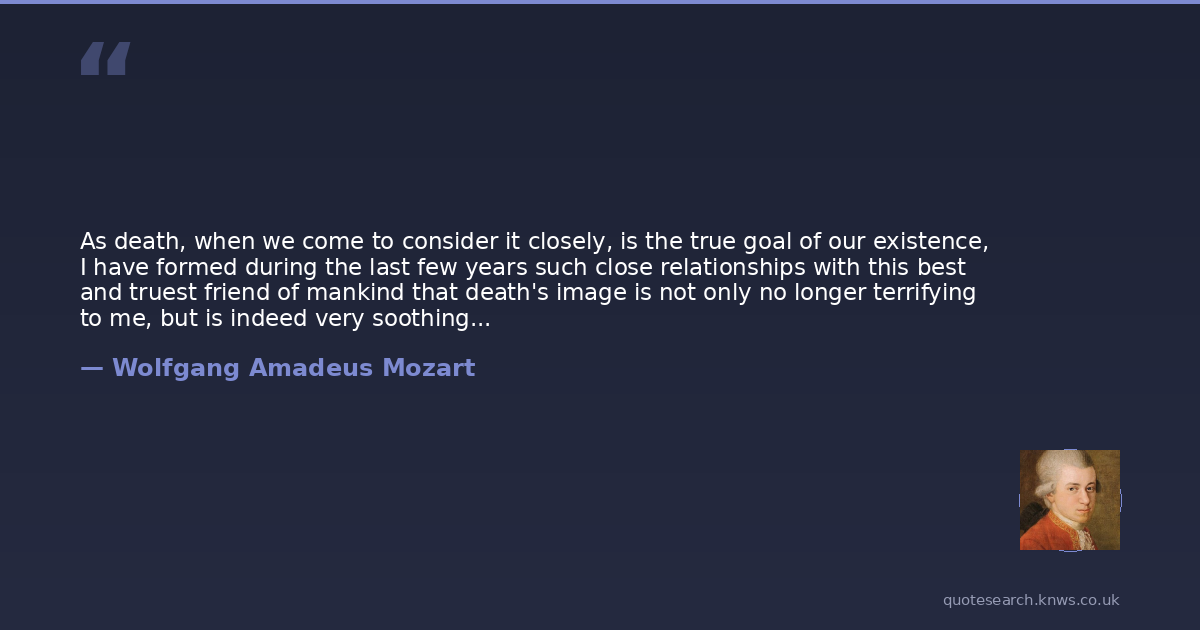 As death, when we come to consider it closely, is the true goal of our existence, I have formed during the last few years such close relationships with this best and truest friend of mankind that death's image is not only no longer terrifying to me, but is indeed very soothing and consoling.