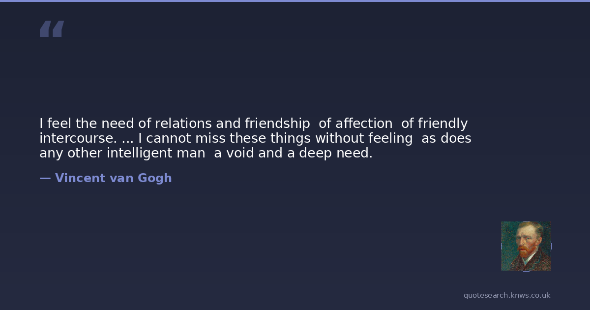 I feel the need of relations and friendship of affection of friendly intercourse. ... I cannot miss these things without feeling as does any other intelligent man a void and a deep need.
