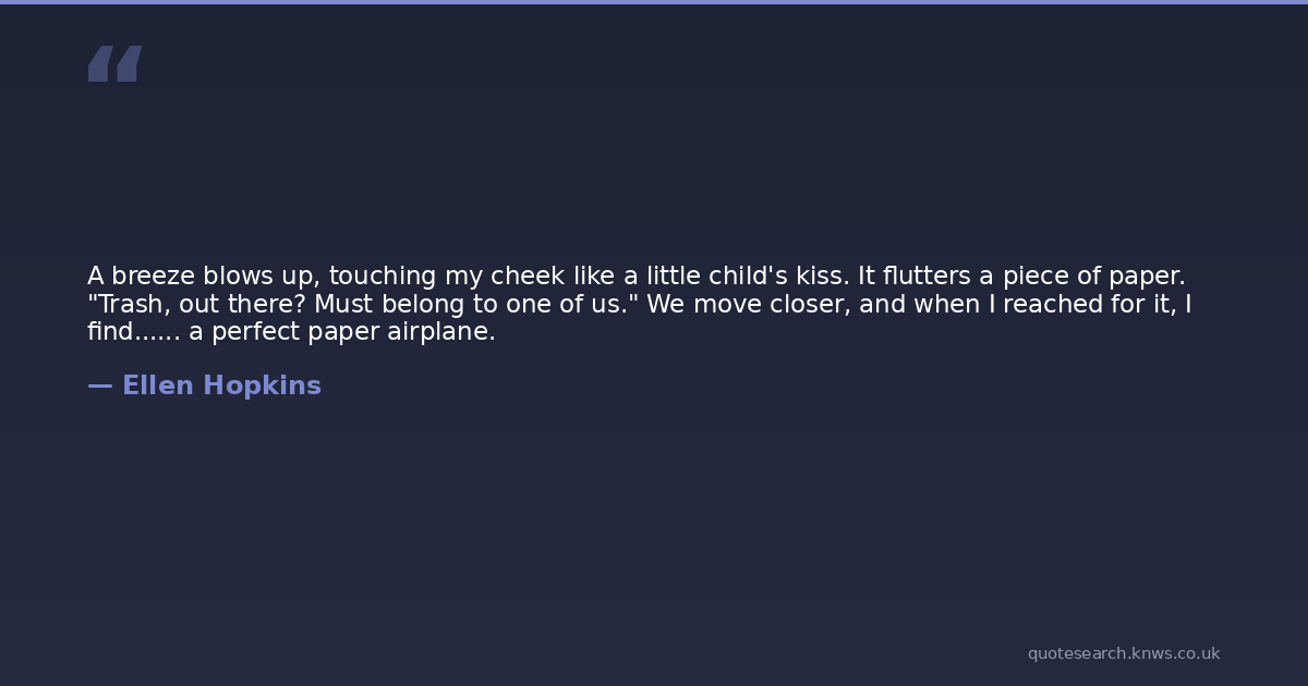 A breeze blows up, touching my cheek like a little child's kiss. It flutters a piece of paper. "Trash, out there? Must belong to one of us." We move closer, and when I reached for it, I find...... a perfect paper airplane.