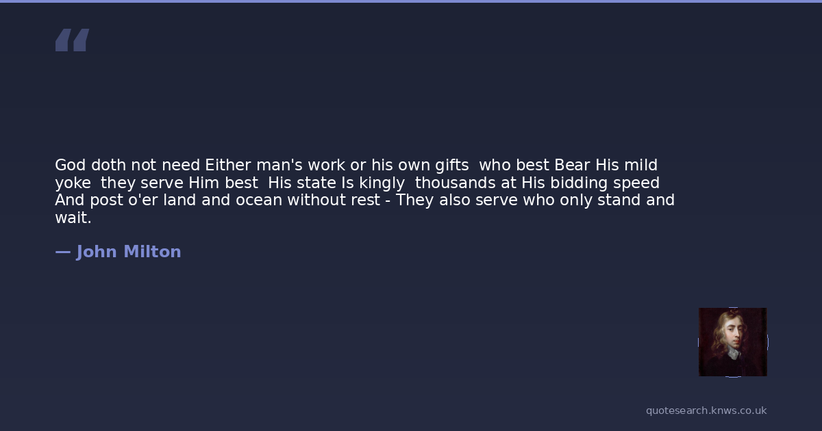 God doth not need Either man's work or his own gifts who best Bear His mild yoke they serve Him best His state Is kingly thousands at His bidding speed And post o'er land and ocean without rest - They also serve who only stand and wait.