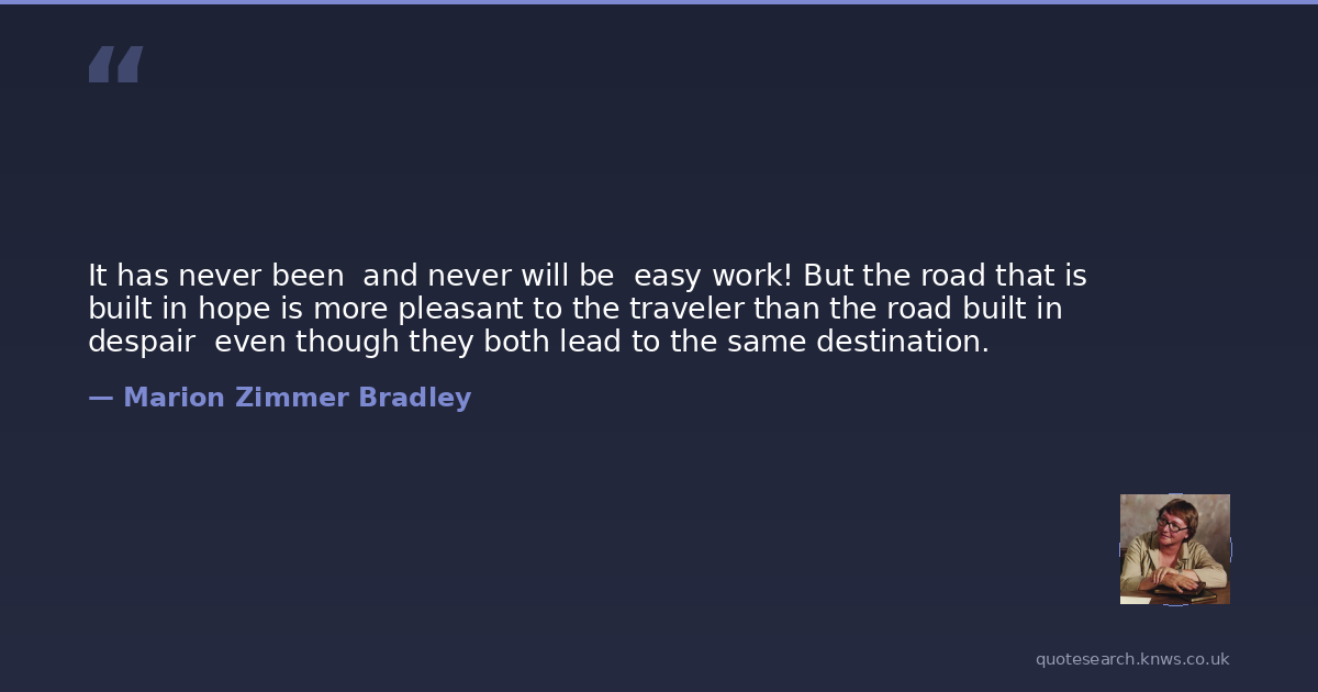 It has never been and never will be easy work! But the road that is built in hope is more pleasant to the traveler than the road built in despair even though they both lead to the same destination.