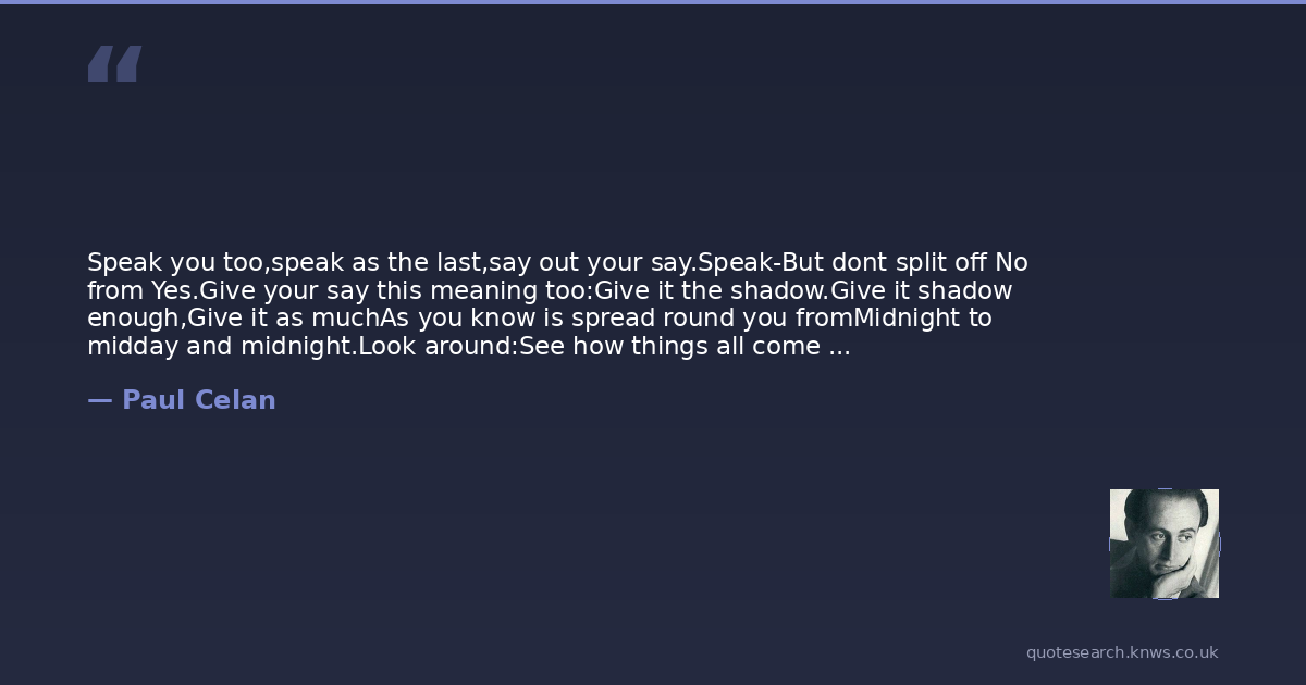 Speak you too,speak as the last,say out your say.Speak-But dont split off No from Yes.Give your say this meaning too:Give it the shadow.Give it shadow enough,Give it as muchAs you know is spread round you fromMidnight to midday and midnight.Look around:See how things all come alive-By death! Alive!Speaks true who speaks shadow.But now the place shrinks, where you stand:Where now, shadow-stripped, where?Climb. Grope upwards.Thinner you grow, less knowable, finer!Finer: a threadThe star wants to descend on:So as to swim down beliow, down hereWhere it sees itself shimmer:in the swellOf wandering words.