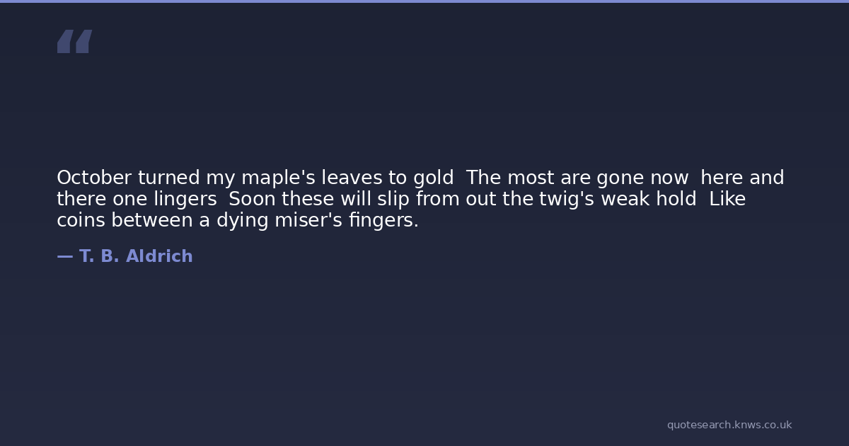 October turned my maple's leaves to gold The most are gone now here and there one lingers Soon these will slip from out the twig's weak hold Like coins between a dying miser's fingers.