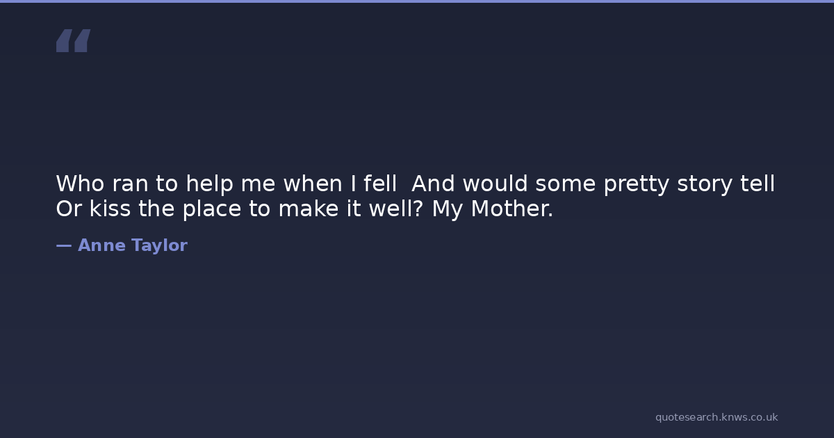 Who ran to help me when I fell And would some pretty story tell Or kiss the place to make it well? My Mother. mother Download Image Share on X Share on Facebook Copy Link